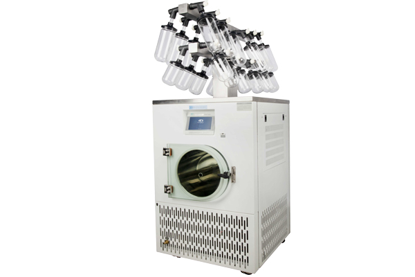 实验室冻干机由一个带真空泵和小型冷阱的基本单元及一些附件组成,在带保温的冷阱圆筒体内有制冷管道,圆筒体真空密封并与真空泵相连,基本单元安装有真空仪表和温度仪表,并有控制开关,放水阀和放气阀等。冷阱的温度有二种,如果单级制冷可达 -50℃左右,如果复叠制冷可达 -80℃左右。实验室冻干机的基本单元可与其他附件进行不同的组合,以适应不同试验产品的冻干,例如与带钟罩的多歧管组合可冻干盛放在烧瓶内的产品,与带压塞机构的板层和钟罩组合可冻干小瓶,与离心附件和钟罩组合可冻干安瓿等。